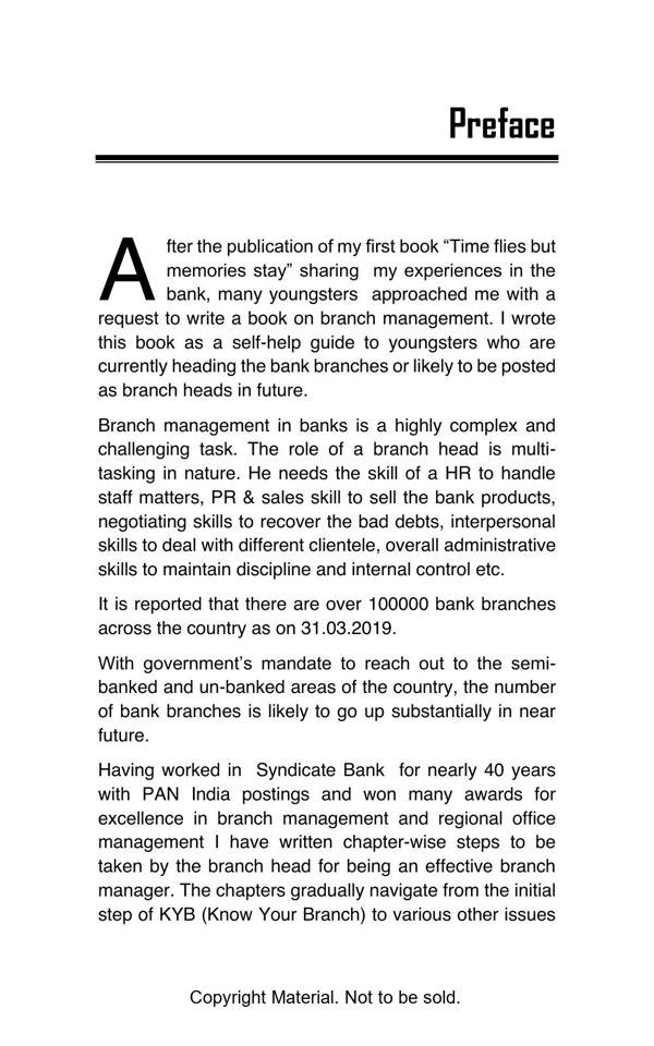 Branch management in banks is a highly complex and challenging task. It is multi-tasking. The chapters in the book gradually navigate from the initial step of KYB (Know Your Branch) to various other issues like staff matters, business potential, bad debts recovery, work prioritization, decision making, handling customer complaints, liaising with higher offices etc. I have shared my own experiences in handling different situations in various branches as a branch head to make the presentation more realistic and engaging. In a nutshell, the book covers the entire gamut of branch banking and paves the way for an effective branch management.