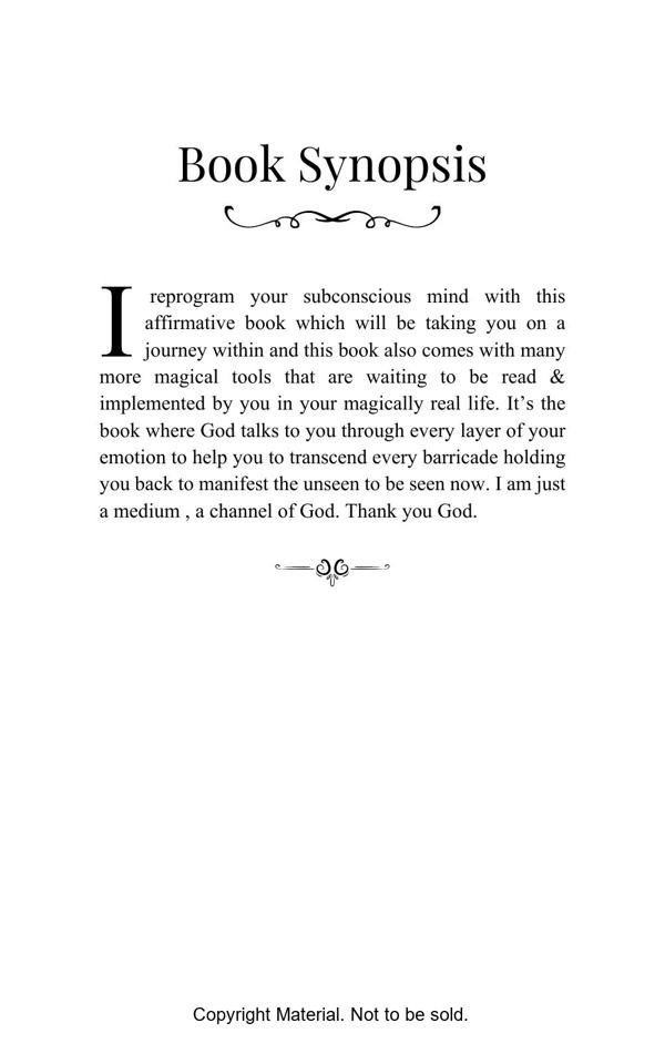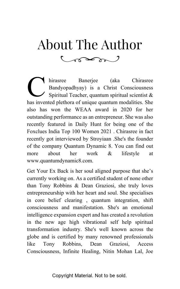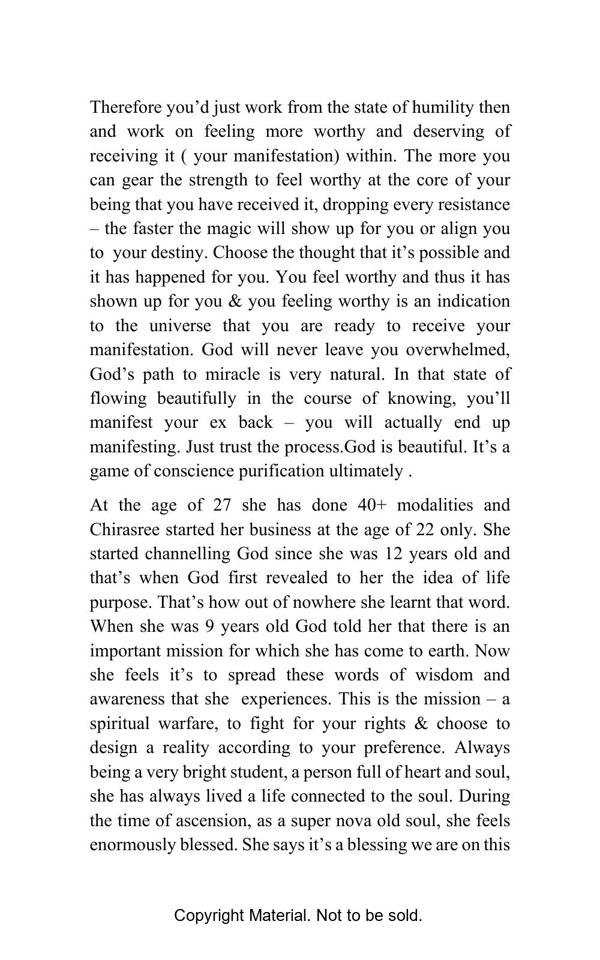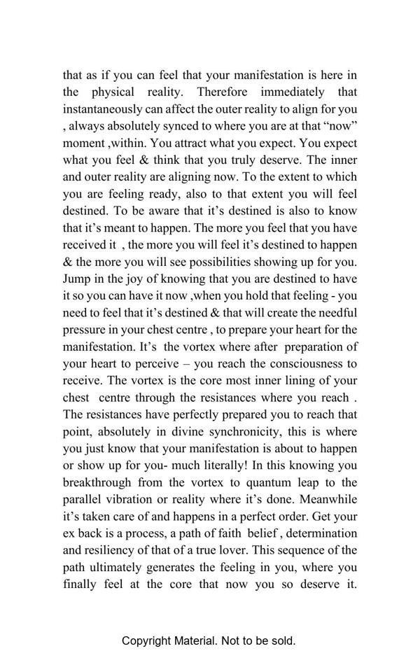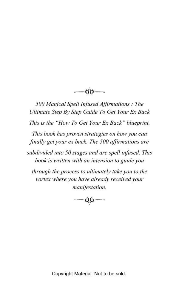This is the “How To Get Your Ex Back” blueprint. This book has proven strategies on how you can finally get your ex back. The 500 affirmations are subdivided into 50 stages and are spell infused. This book is written with an intension to guide you through the process to ultimately take you to the vortex where you have already received your manifestation.