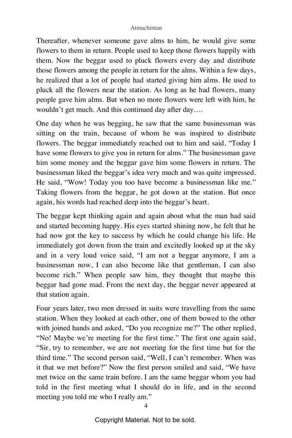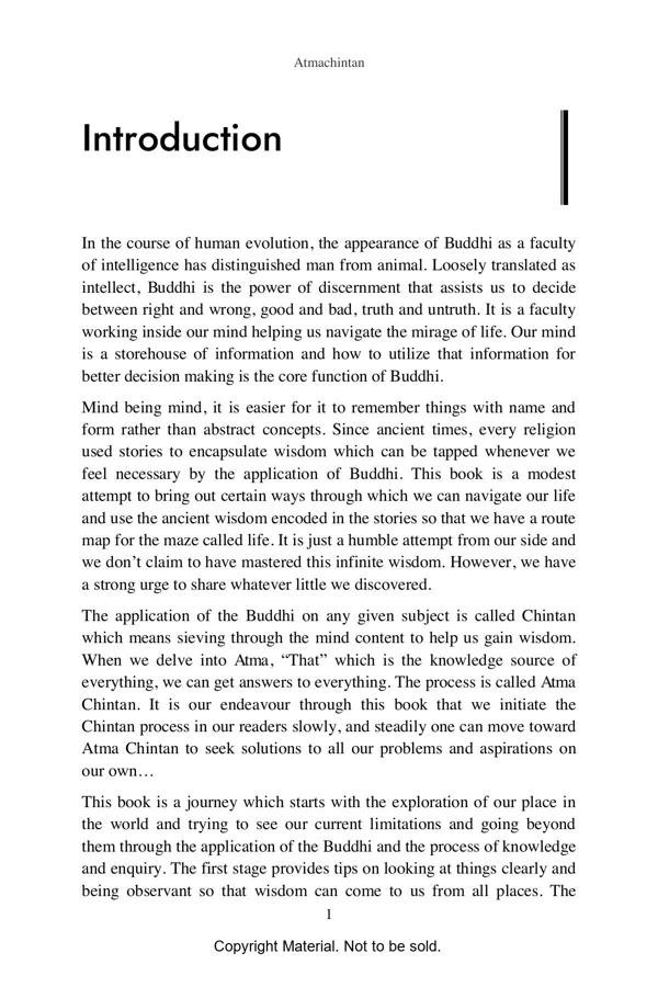 This book is a journey which starts with the exploration of our place in the world and trying to see our current limitations and going beyond them through the application of the buddhi and the process of knowledge and enquiry. The first stage provides tips on looking at things clearly and being observant so that wisdom can come to us from all places. Second stage discusses practice and knowledge of our limitations and how we can go beyond those limitations. Third stage talks about how we go about beyond our current self and become truly one with the SELF!