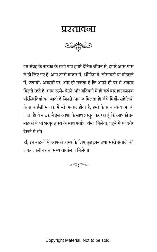 They say that humour is the best medicine and it’s truly so. If we care to look for it, humour abounds everywhere. In our daily lives we come across many situations, sights and sayings that amuse us.There are good punsters and pranksters in all groups of people, friends, family, workplace teams etc. They provide the requisite dose of humour for the happiness of all. The plays in the book have been written with this background in mind. They have characters and situations that are familiar to all. There is enough for every reader / viewer for their entertainment. Of course, sarcasm goes hand in hand with humour.