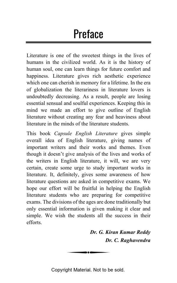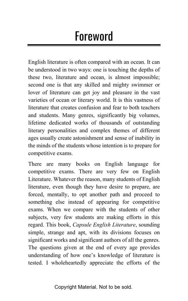 Capsule English Literature is, as the name suggests, a comprehensive study of English Literature. The vastness of English literature with many writers, works, themes, genres, and dimensions, major and minor, mystifies the students and teachers. This book is primarily intended to meet the requirements of graduate and postgraduate students who are ready to appear for state and national level competitive exams. There are several books with big volumes. But this book focuses on major writers and their contributions. It enables the students to get an overall idea of English Literature from Chaucer to the present era. It provides knowledge of how questions are asked in competitive exams. This book will be useful to the students of literature in their preparation for State Eligibility Test and National Eligibility Test.