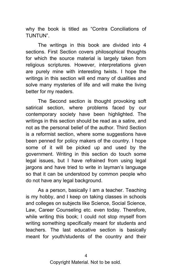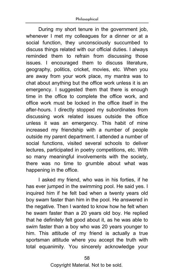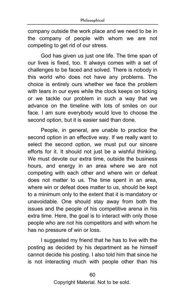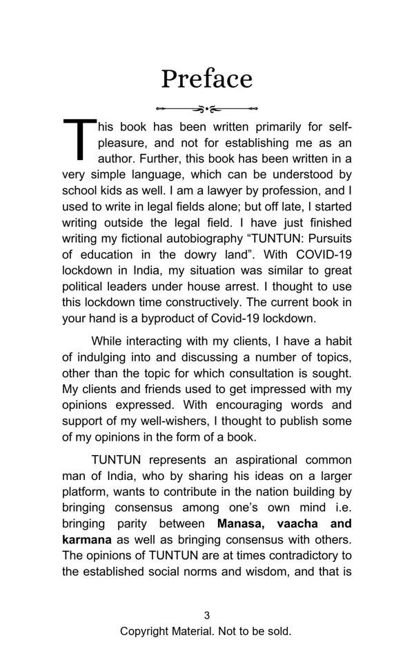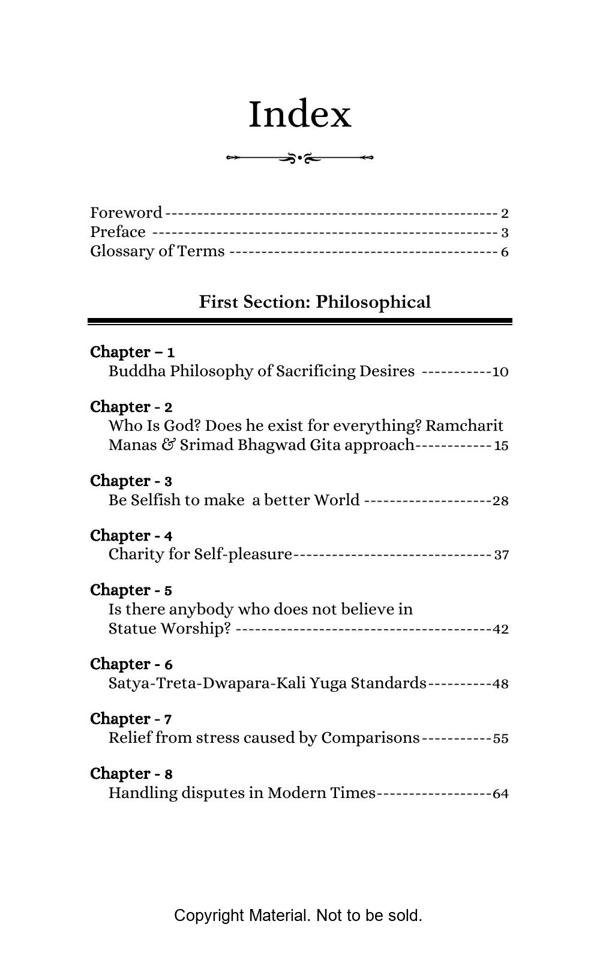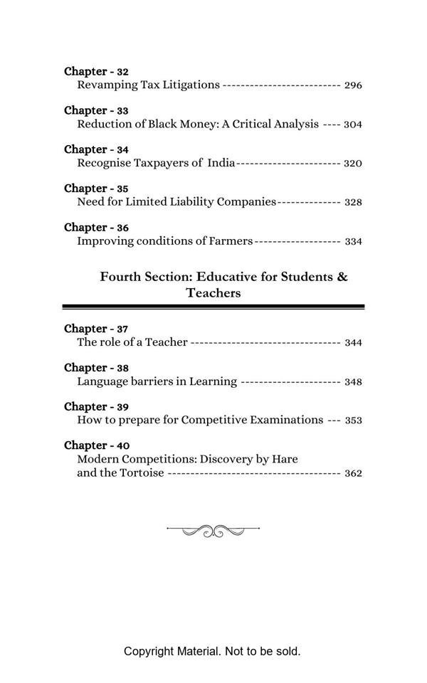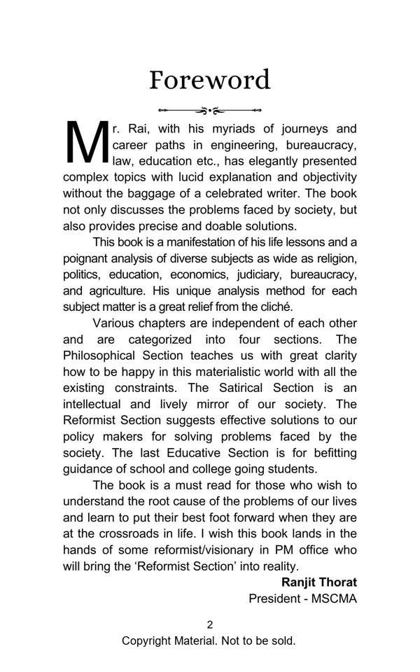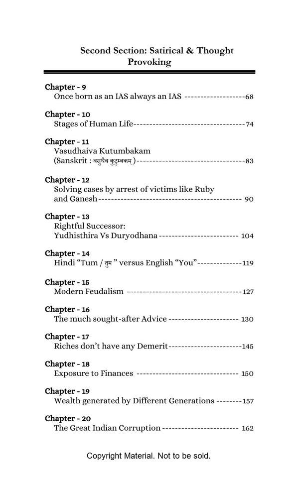 The book elegantly presents complex topics with lucid explanation and objectivity. The Philosophical Section gives a true interpretation of Bhagwad Gita and Buddha philosophy and teaches us with great clarity, how to be happy in the materialistic world. The Satirical Section is an intellectual and lively depiction of Indian bureaucracy and investigating agencies. The Reformist Section suggests effective solutions to problems faced by the society. The Educative Section is for befitting guidance of school and college going students. The book is a treatise on putting our best foot forward against all odds and darkness in life.