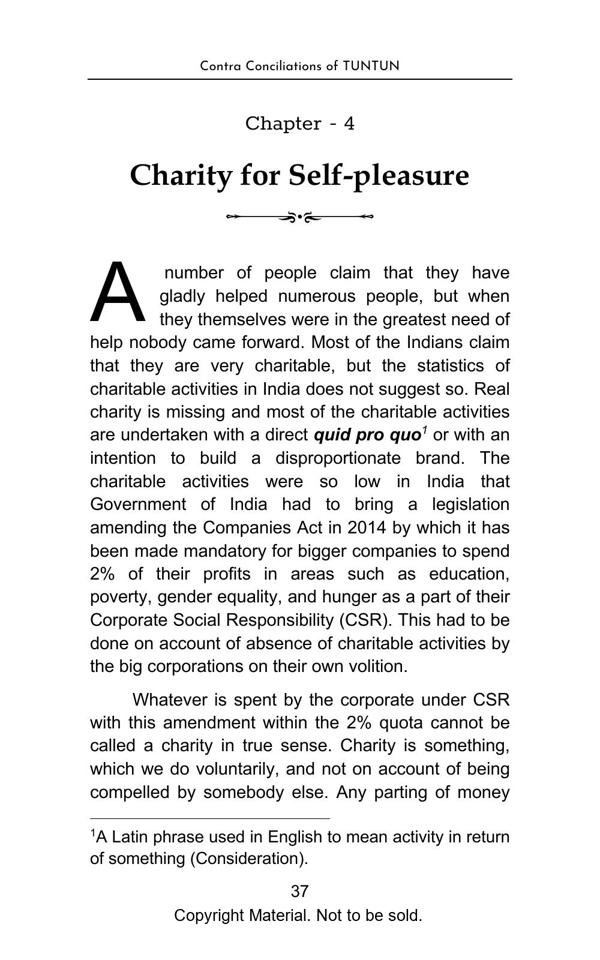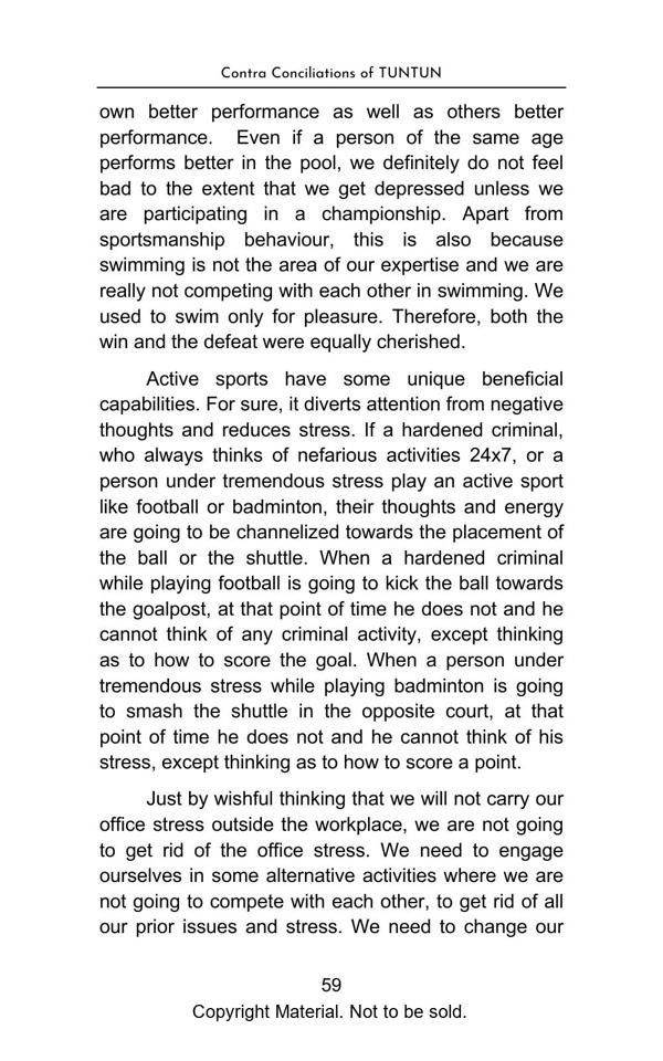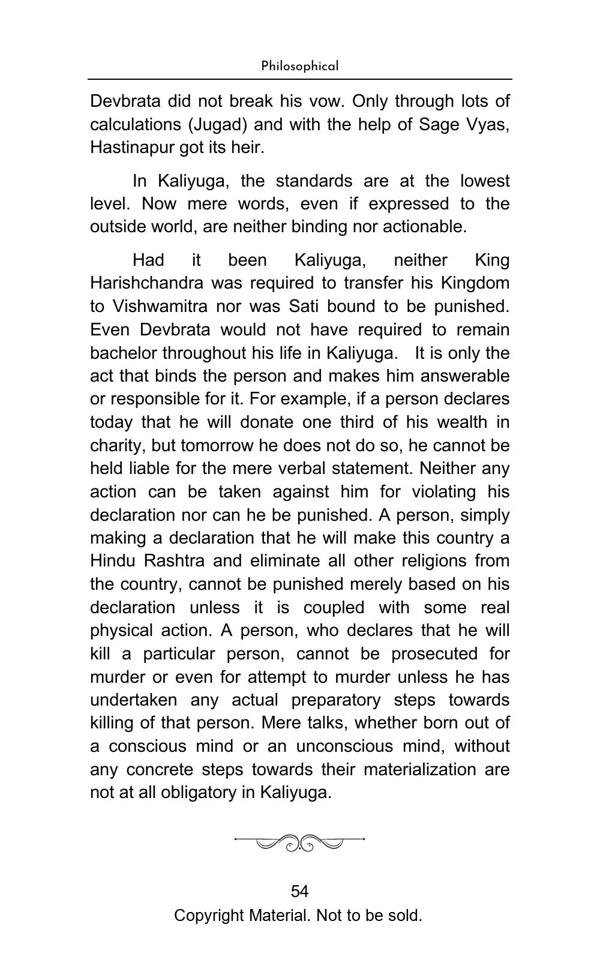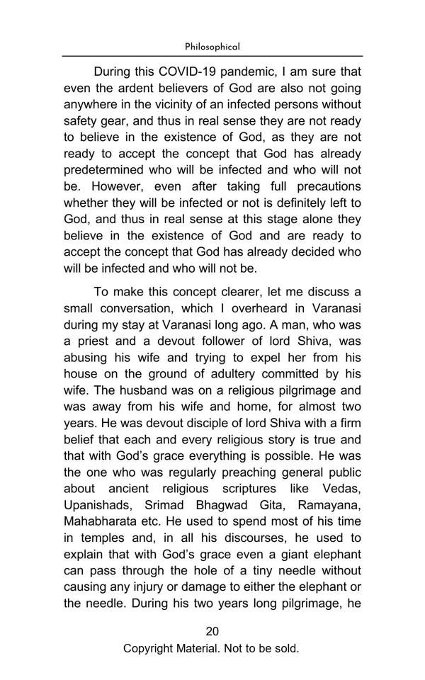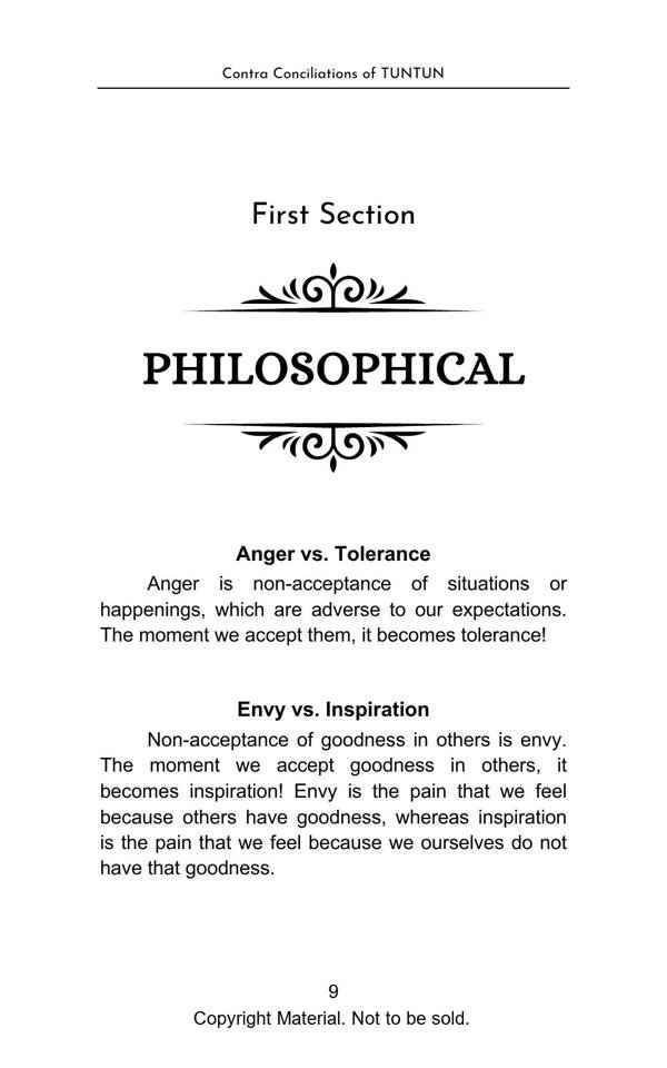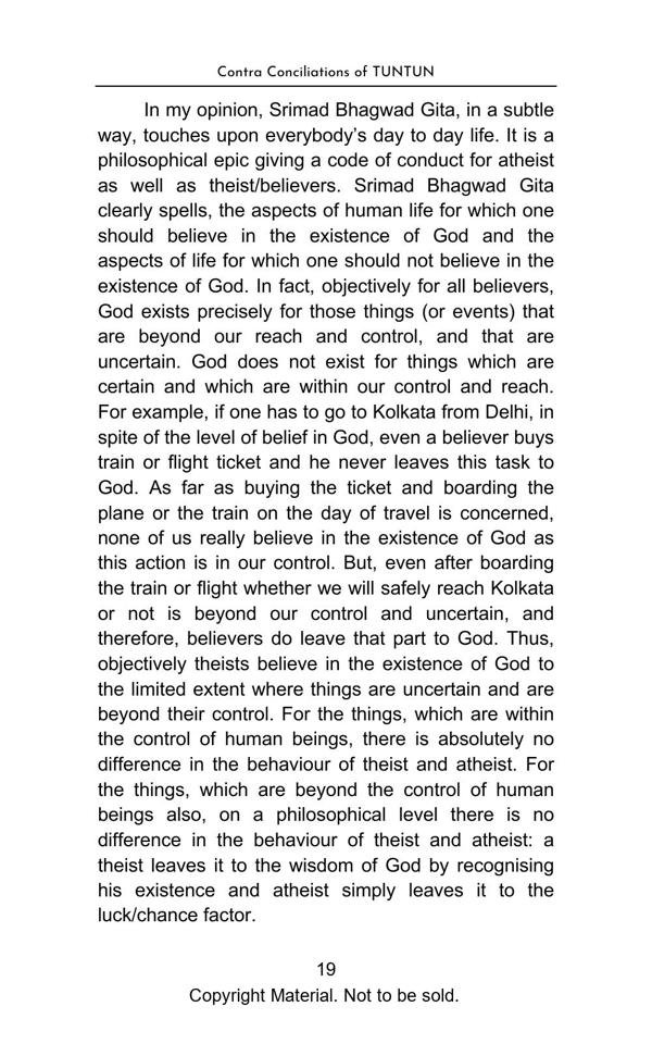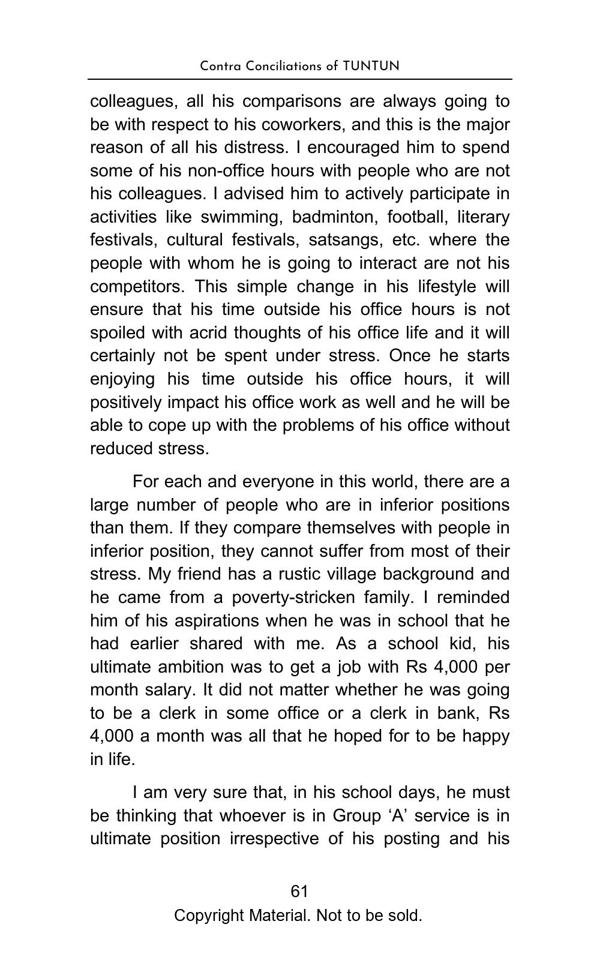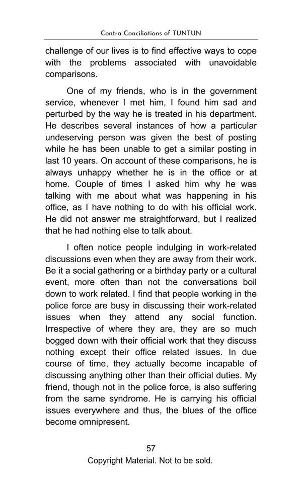 The book elegantly presents complex topics with lucid explanation and objectivity. The Philosophical Section gives a true interpretation of Bhagwad Gita and Buddha philosophy and teaches us with great clarity, how to be happy in the materialistic world. The Satirical Section is an intellectual and lively depiction of Indian bureaucracy and investigating agencies. The Reformist Section suggests effective solutions to problems faced by the society. The Educative Section is for befitting guidance of school and college going students. The book is a treatise on putting our best foot forward against all odds and darkness in life.