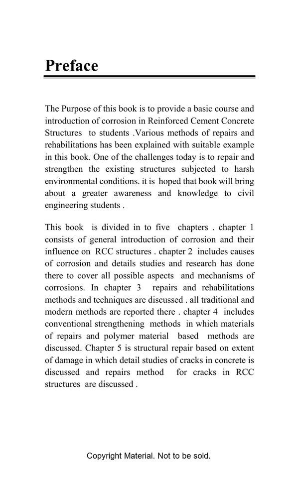 The Purpose of this book is to provide a basic course and introduction of corrosion in Reinforced Cement Concrete Structures to students. Various methods of repairs and rehabilitations has been explained with suitable example in this book. One of the challenges today is to repair and strengthen the existing structures subjected to harsh environmental conditions. It is hoped that book will bring about a greater awareness and knowledge to civil engineering students.