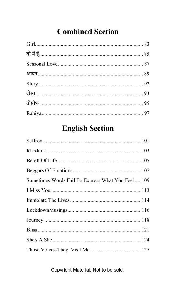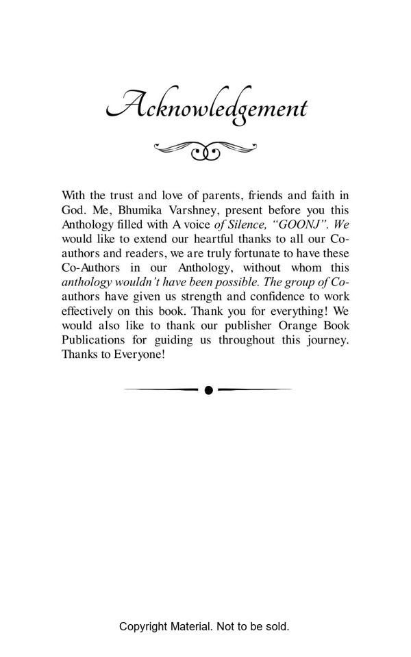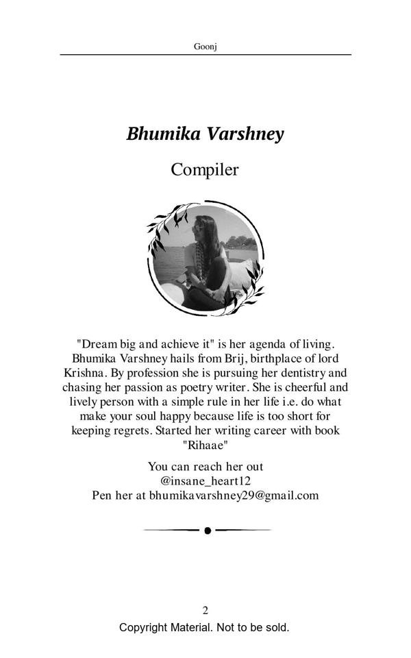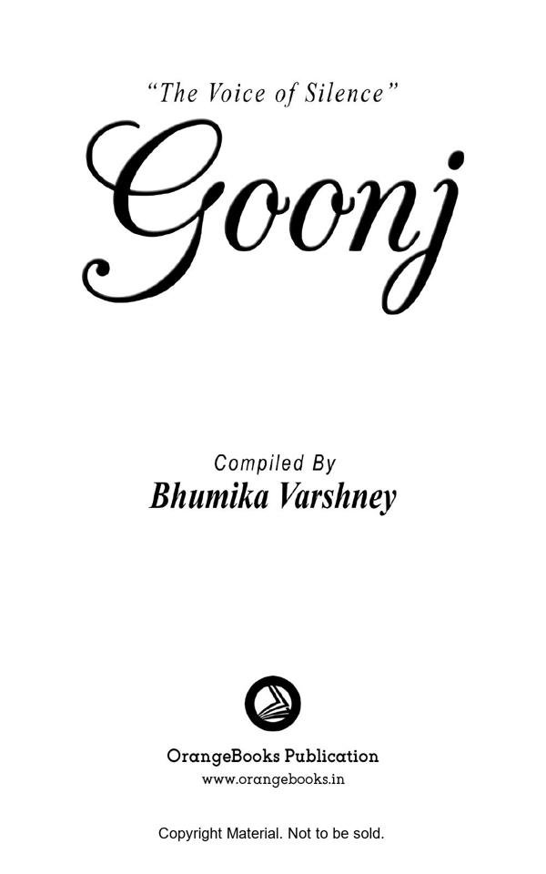 Goonj / Echo consists of hindi as well as English poetries of different writers. Goonj is defined as voice of silence, silence which we have in our body, a voice that broke us from inside many times, but then sudden voice and echo which gives us a power again to stand. This book contains write up of different co-author from all over the India. Which makes us unite, a unity and a sound, an echo to say our words in this world.