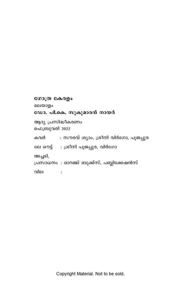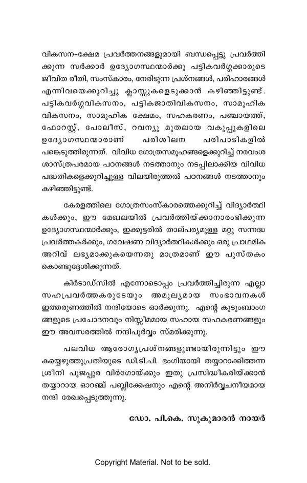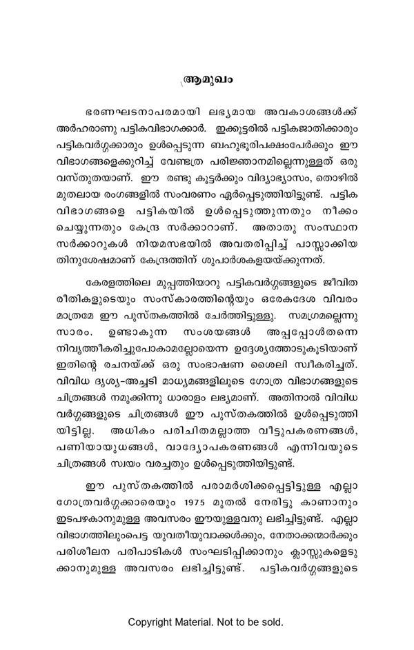 This book, written in Malayalam, is intended to render a first-hand information about the thirty-six Scheduled Tribes of the State of Kerala. The conversation style makes the narrative interesting and helps to clarify the questions arising in the reader’s mind then and there. The book consists of fourteen chapters, the titles of which could be translated in English as follows: 1. Importance of reservation, 2. Major Scheduled Tribes, 3. Occupation, 4. Education, 5. Marriage, 6. Social control, 7. Family organisation, 8. House and household equipment, 9. Religion, 10. Art and rituals, 11. Medicinal practices, 12. Bogus ST claims, 13. Major problems, and 14. Tribal development.