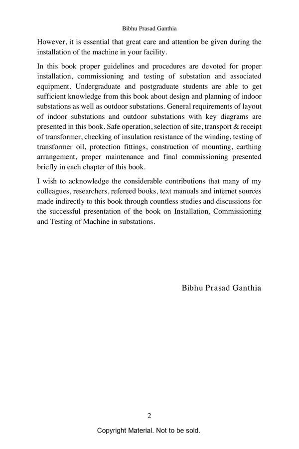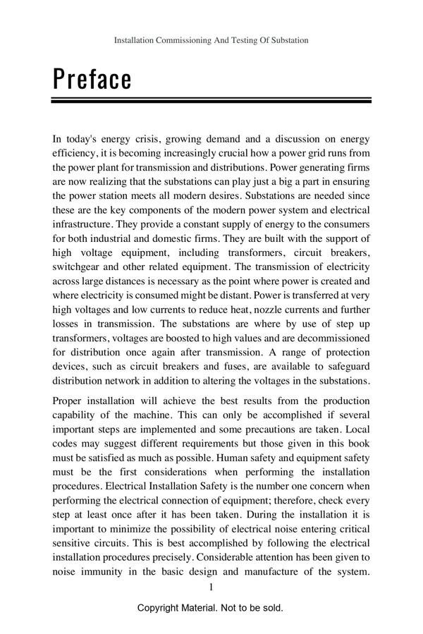 In this book proper guidelines and procedures are devoted for proper installation, commissioning and testing of substation and associated equipment. Undergraduate and postgraduate students are able to get sufficient knowledge from this book about design and planning of indoor substations as well as outdoor substations. General requirements of layout of indoor substations and outdoor substations with key diagrams are presented in this book. Safe operation, selection of site, transport & receipt of transformer, checking of insulation resistance of the winding, testing of transformer oil, protection fittings, construction of mounting, earthing arrangement, proper maintenance and final commissioning presented briefly in each chapter of this book.
