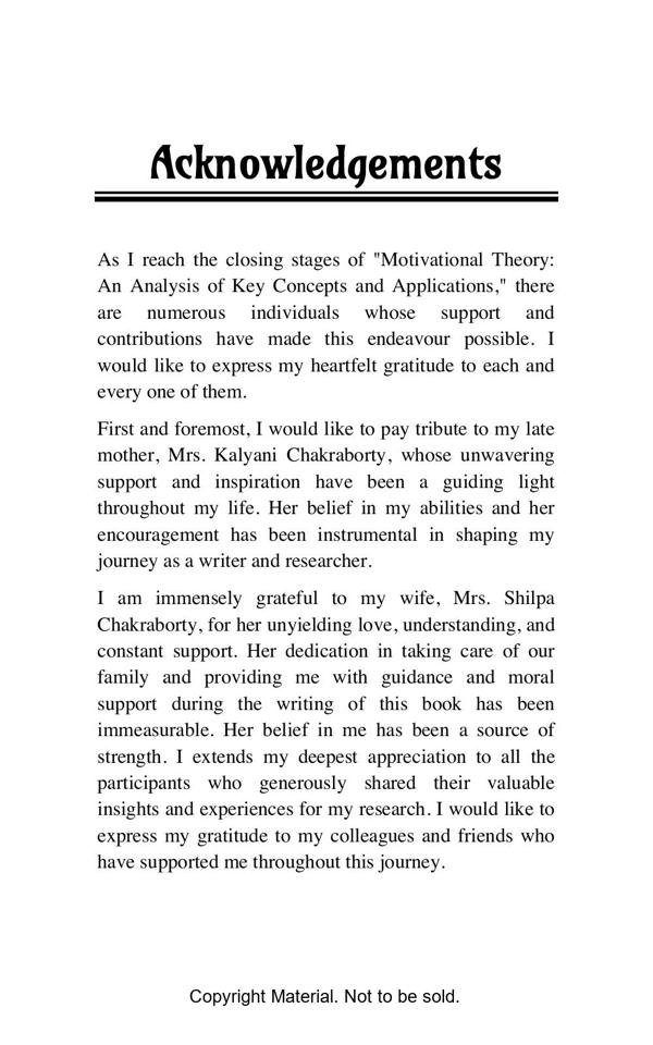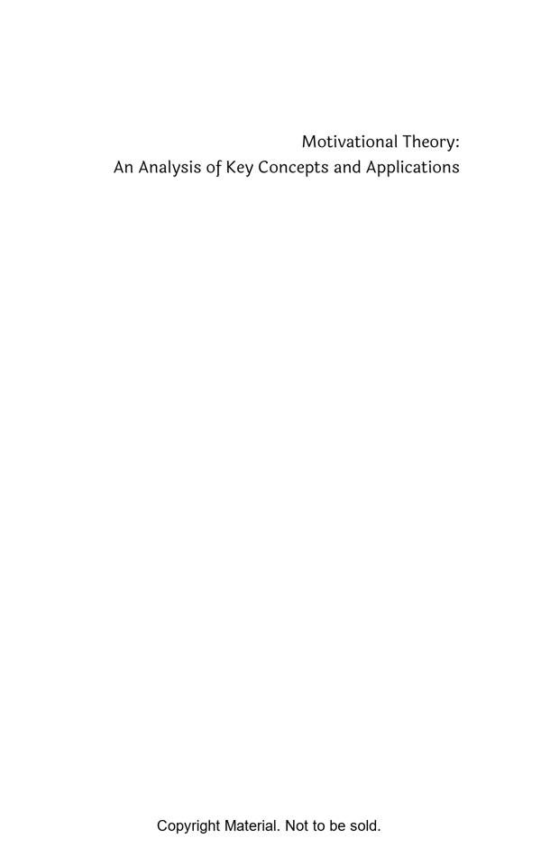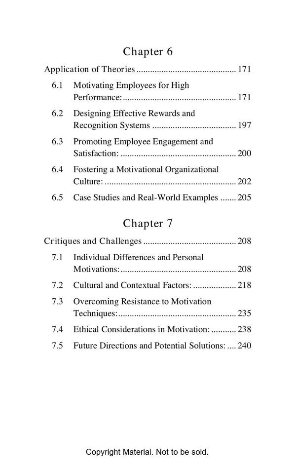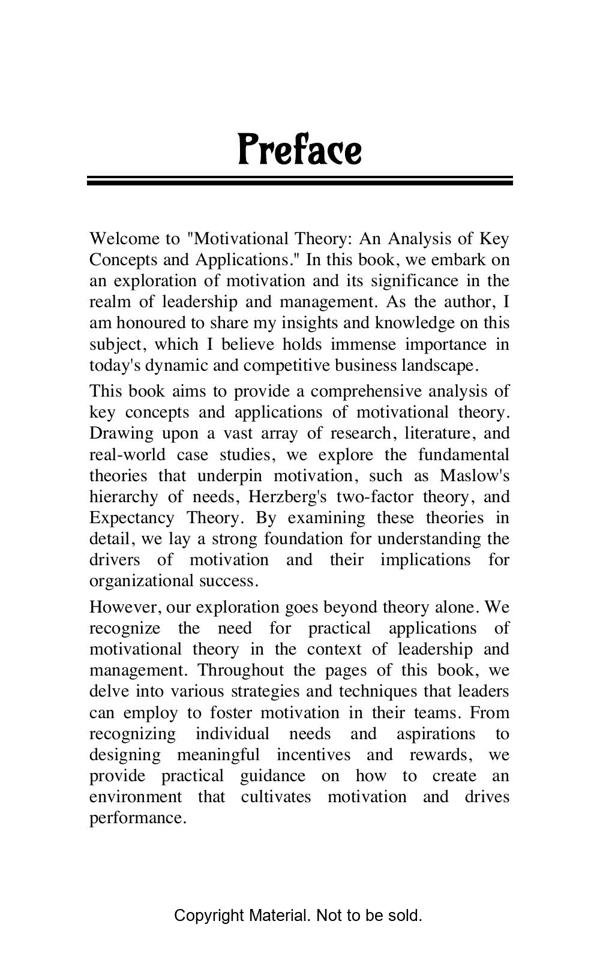 The book titled “Motivational Theory: An Analysis of Key Concepts and Applications” offers a comprehensive exploration of motivation and its various theories. It consists of eight chapters covering topics such as foundational concepts, cognitive and behavioural theories, contemporary perspectives, and practical applications. With a page range of 5-145, the book provides an in-depth analysis of motivational theories in different contexts. It adopts a structured approach, starting from basics and progressing to advanced concepts, facilitating effective comprehension. The book incorporates theories like Maslow’s Hierarchy of Needs, Herzberg’s Two-Factor Theory, and Expectancy Theory, ensuring a well-rounded understanding of motivational concepts. It also addresses critiques and challenges in Chapter 7, and concludes with key findings and implications. The reference section provides valuable citations for further exploration. Overall, the book serves as a valuable resource for students, researchers, and professionals seeking a comprehensive understanding of motivational theories and their practical applications.