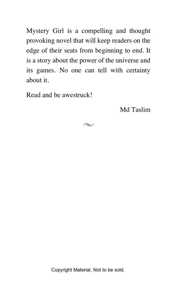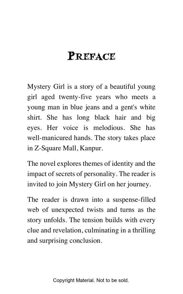 Mystery Girl is a story of a beautiful young girl aged twenty-five years. She comes and goes and leaves a note. It appears she will not ever come. Get ready to be swept away by the mystery of Mystery Girl! Mystery Girl is a gripping and suspenseful novel that will keep readers guessing until the end. With its intricate plot and unexpected twists, it’s a must-read to know this unique game of universe of mystery and suspense.