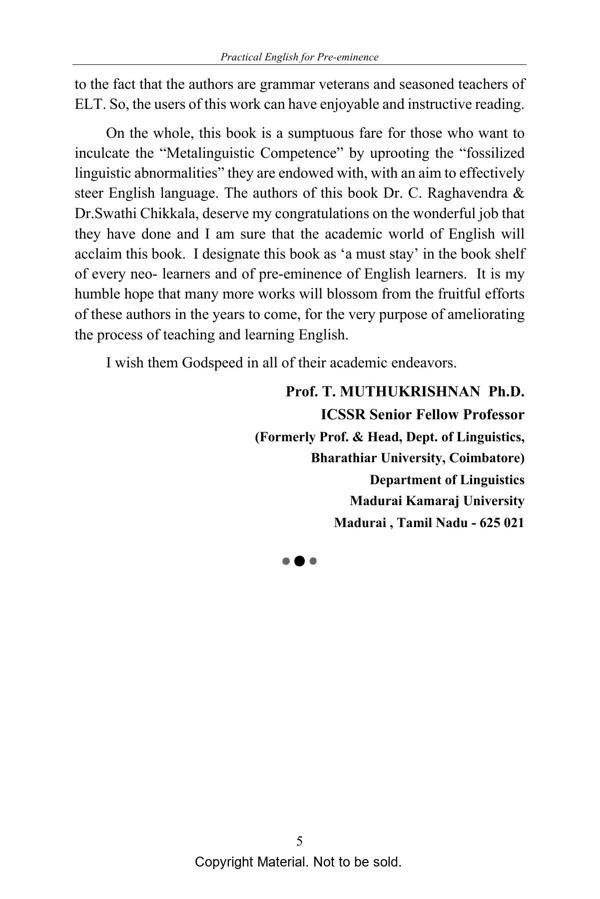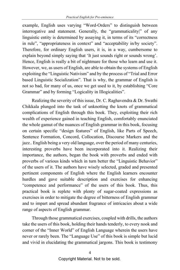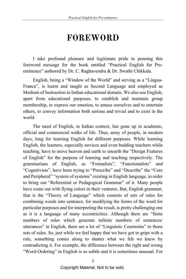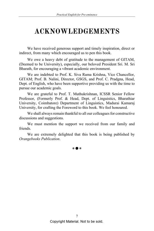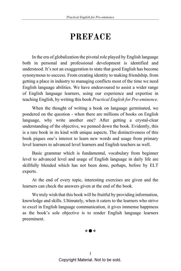 Practical English for Pre-eminence’ is a rare book in its kind with unique aspects. The distinctiveness of this book piques one’s interest to learn new words and usage from primary level learners to English teachers. The authors have enunciated the whole gamut of the nuances of English grammar in this book, focusing on certain specific ?”design features” of English. Pertinent components of English have been wisely selected, graded and presented. This practical book is replete with plenty of sugar-coated expressions as exercises in order to mitigate the degree of bitterness of English grammar and to impart and spread abundant fragrance of intricacies about a wide range of aspects of English grammar and usage.