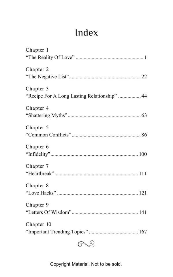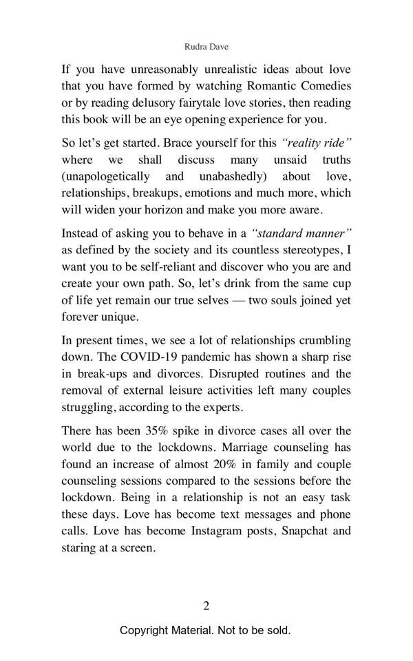 In the fast paced world we live in, forming and sustaining relationships is difficult. During the COVID-19 Pandemic, there has been a 35% spike in divorce cases all over the world due to the lock down. Having a blissful romance is not an easy task these days. Love has become text messages and phone calls. Love has become Instagram posts, Snapchat and staring at a screen. Love has become more about hook ups and swiping right and left on dating apps instead of having an emotional depth and commitment in relationships. Love these days has become crawling back to a person who has hurt, manipulated and lied to you. People are so empty and lonely that they mistake mere attention for love and eventually get their heart broken. Love and heartbreak have become interchangeable words. Many people are scared to fall in love. Why? What are the issues? How to prevent and successfully deal with major conflicts in your relationship? These are some of the questions which this book will answer and will be a one stop solution to most of your relationship and personal conflicts and dilemmas.