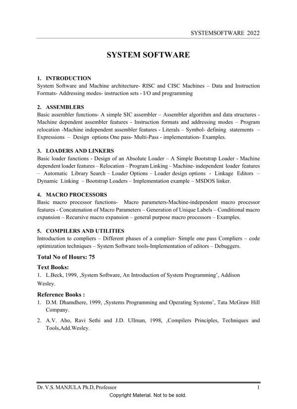 This text is an introduction to the design and implementation of various types of system software. A central theme of the book is the relationship between machine architecture and systems software. This book contents based on Anna University and Deemed University and exampled based designed. This book contains a wide selection of examples and exercises which are all optional, providing flexibility to instructors by allowing them to concentrate on the software and architecture they want to cover.