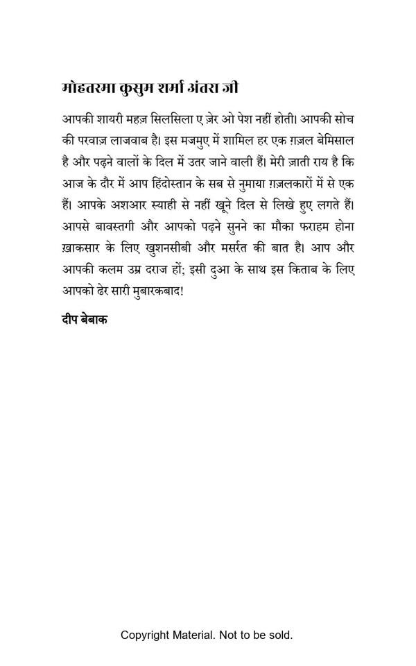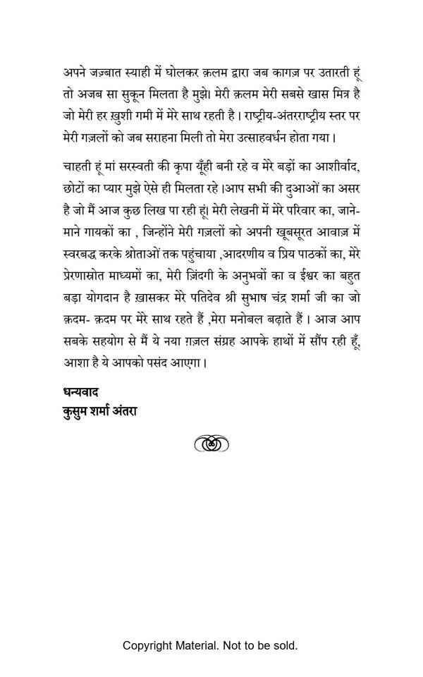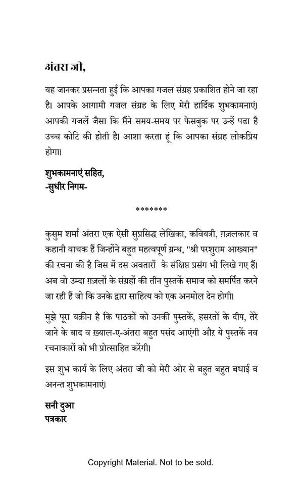 Ghazals book by famous writer /poetess/shayra Ms. Kusum Sharma ANTRA is a tale of human emotions. The ghazals in this book touches the hearts and souls of the readers and takes them to another world. Respected readers, talented singers, famous writers, poets, shayars, great journalists, dedicated artists  and renowned intellectuals appreciated the ghazals of Ms. Kusum Sharma ANTRA.