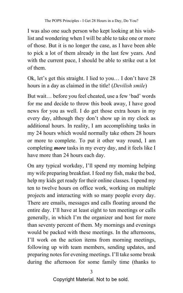 Have you ever wondered there’s so much to do in life, but never enough time! You want to pursue that hobby from ages, but there was always something else to attend to. And how you wished a Genie would grant you few ‘extra’ hours every day! I’m not a Genie, but… there you go! Presenting POPS Principles – simple and realistic techniques that I adopted to drastically improve my life. Through this book, I am sharing some of my experiences and suggestions on how to optimize your time to achieve more. If I can do so much daily, so can you!