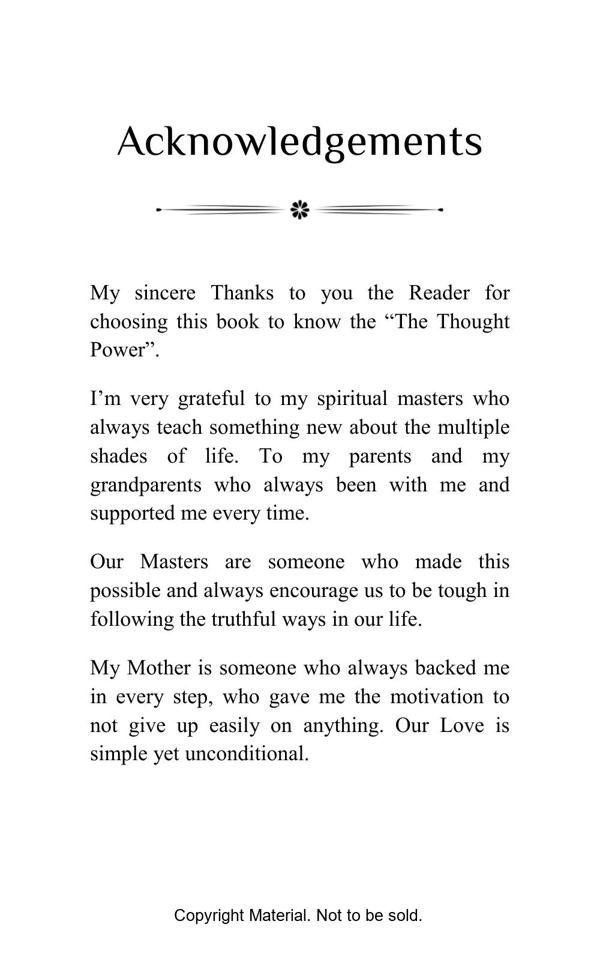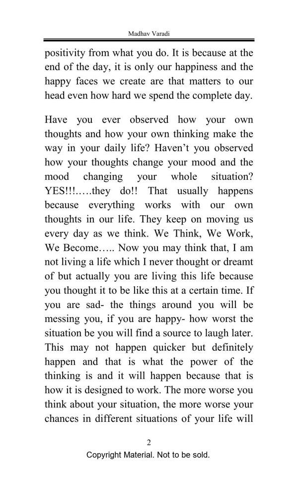 “The Thought Power” is something which is to tell the power of your own thinking and your own thoughts. The thoughts which can bring the glory you are missing in your life and which brings something you always wanted to have in your life. We talk about the power of thinking which can change the complete way of living, showing a new way in your life. This book is to tell the knowledge of the thought power and how it shapes peace and happiness in the people who think they only have sadness and truly wants to change their life.