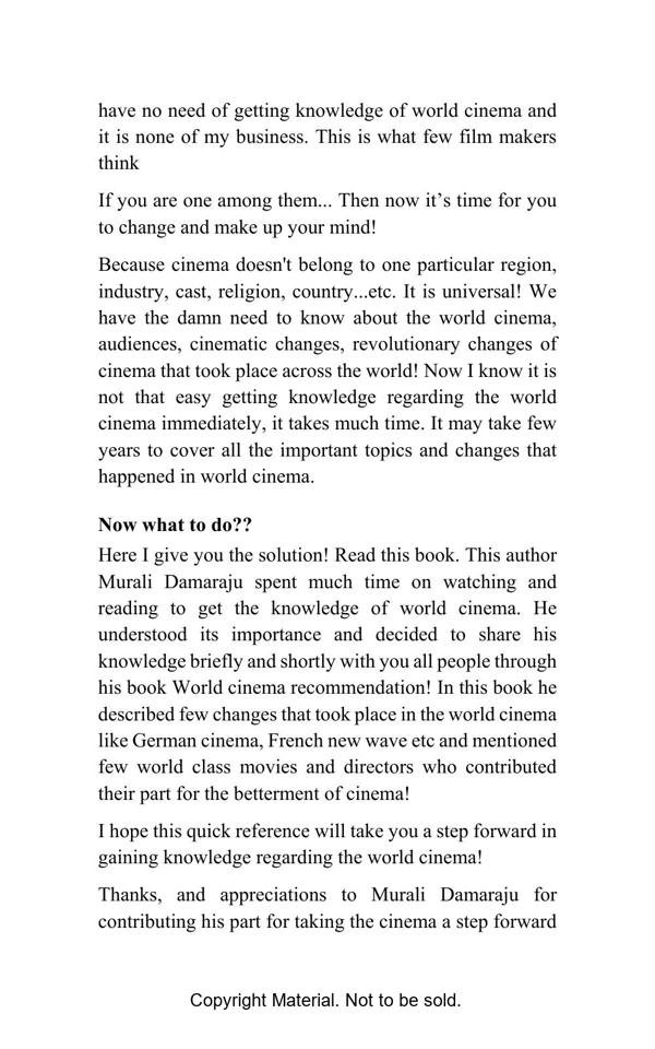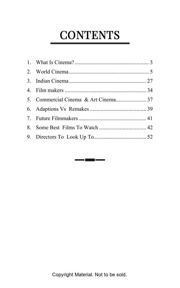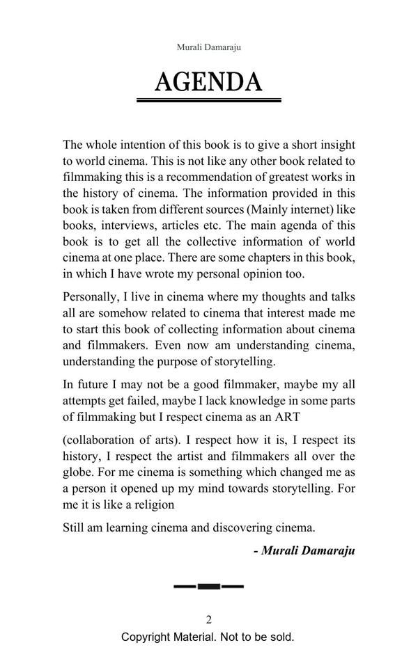 This book is the collective information regarding world cinema and the importance of world cinema. This book intends to be a basic handbook for the film aspirants and beginners. This book includes the major cinematic moments took place in the history of cinema and some great film recommendation and a short introduction about the Legendary filmmakers in the history of cinema.