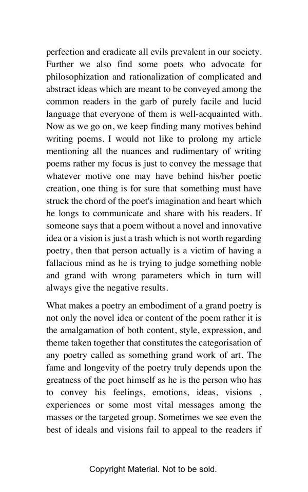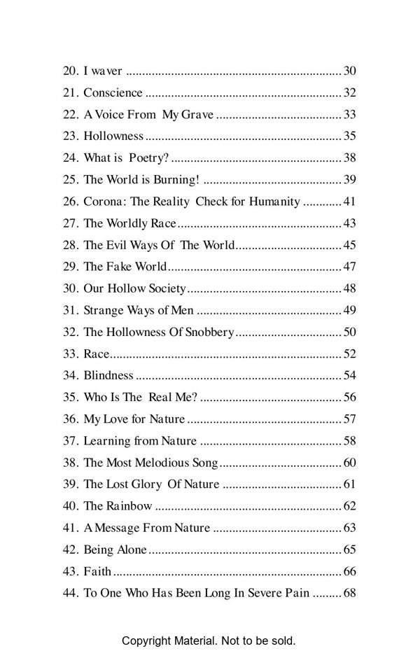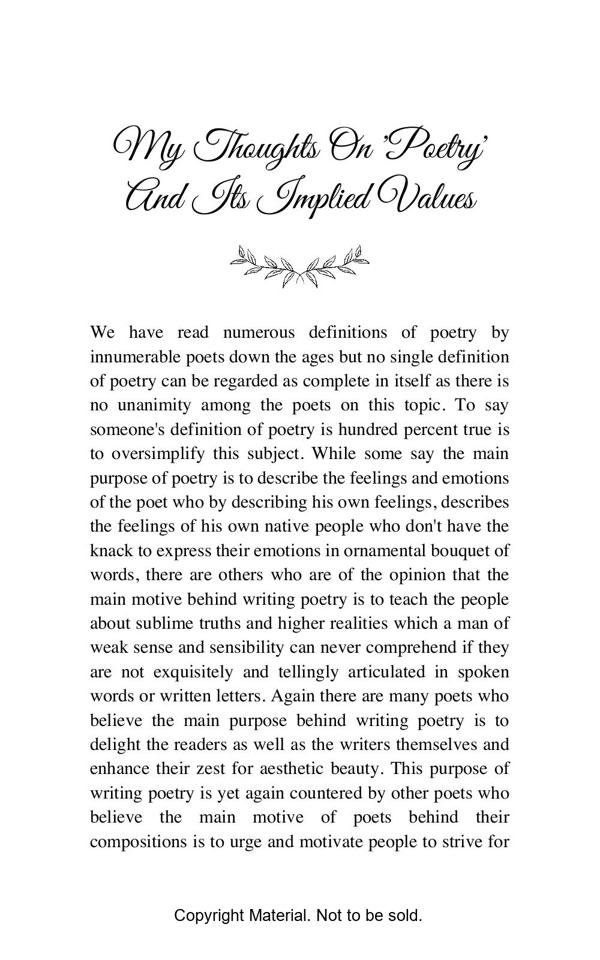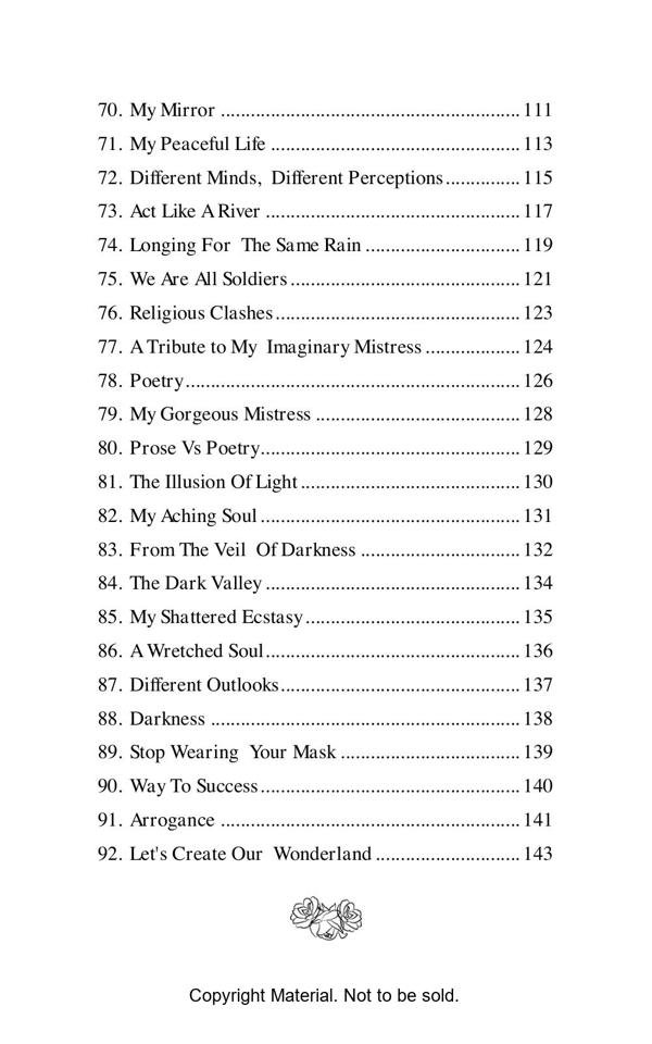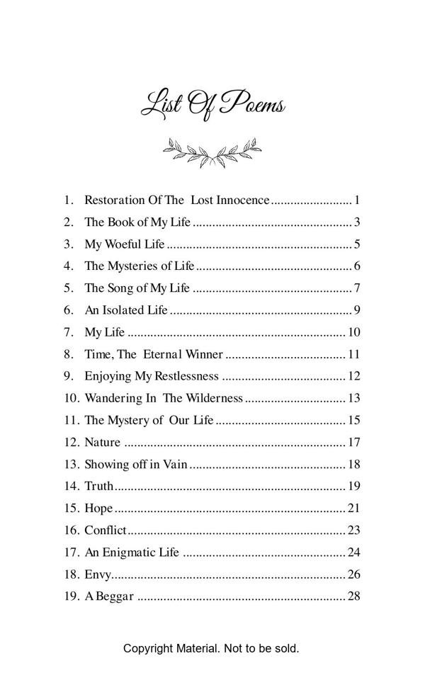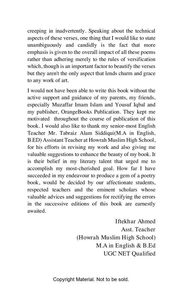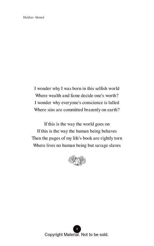 This book opens a flood of emotional outlet before every sensitive and impassioned reader who wish to see the essence of every aspect of our life on this mundane world. In fact the readers of this book will be transported to altogether a different land once they start perusing the depth of the feelings expressed with profound sentiments of the heart.
