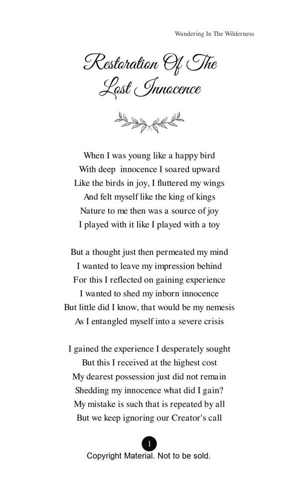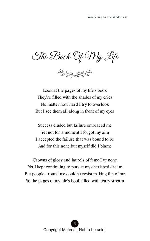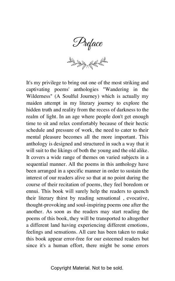 About My Book: “Wandering in the Wilderness”(A Soulful Journey) is my first anthology of poems where I have expressed my heartfelt emotions and longings in a lucid way to alleviate the pains and sufferings of my life and it also caters to recapitulate some of my happiest moments of life that I have lived imagining my most beloved mistress with whom I have spent some quality time in my dreams. This book opens a flood of emotional outlet before every sensitive and impassioned reader who wish to see the essence of every aspect of our life on this mundane world. In fact the readers of this book will be transported to altogether a different land once they start perusing the depth of the feelings expressed with profound sentiments of the heart.